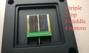 The device consists of 4 x 1cm2 cells mounted in an area of 2 x 2 cm. Calibration data is provided for the three (3) individual component cells. A component cell is a single junction cell but made exactly the same as a the triple junction cell. So each component has three layers where only layer is electrically active.